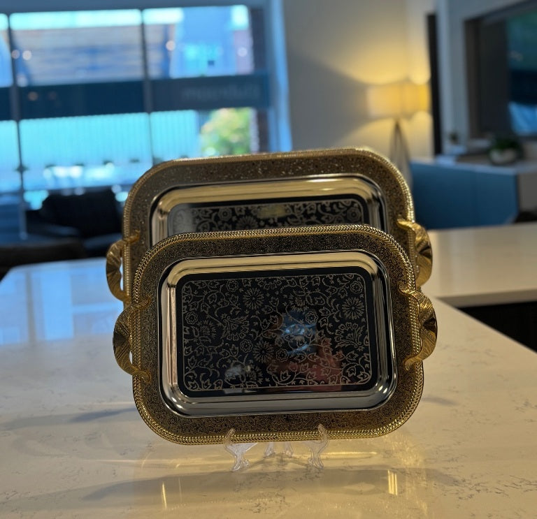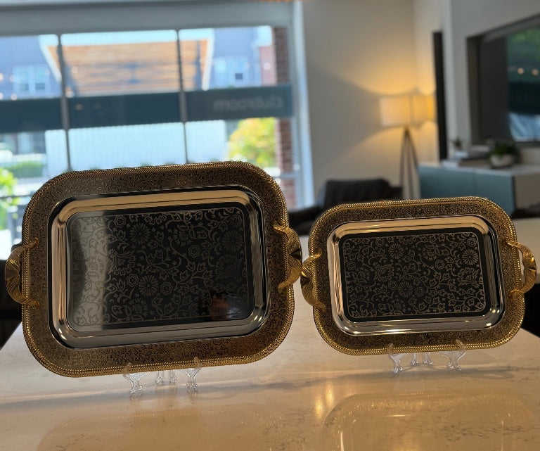 Add elegance to your serving collection with this 2-piece stainless steel serving tray set, beautifully designed with a silver center and a gold accent border. Perfect for special occasions or everyday use, these trays combine style with practicality.
