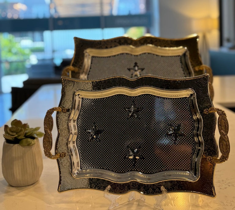 2-piece serving tray set in silver with gold border