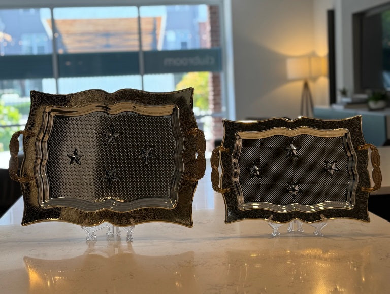 Elevate your serving style with this 2-piece stainless steel tray set, beautifully designed with a sleek silver center and a gold accent border. Perfect for special occasions, gatherings, or everyday use, these trays add a touch of elegance to any table setting.