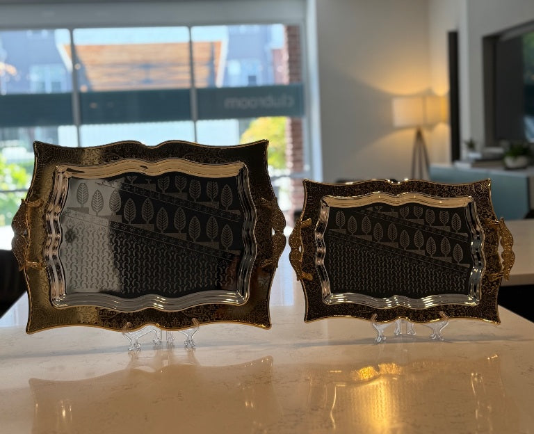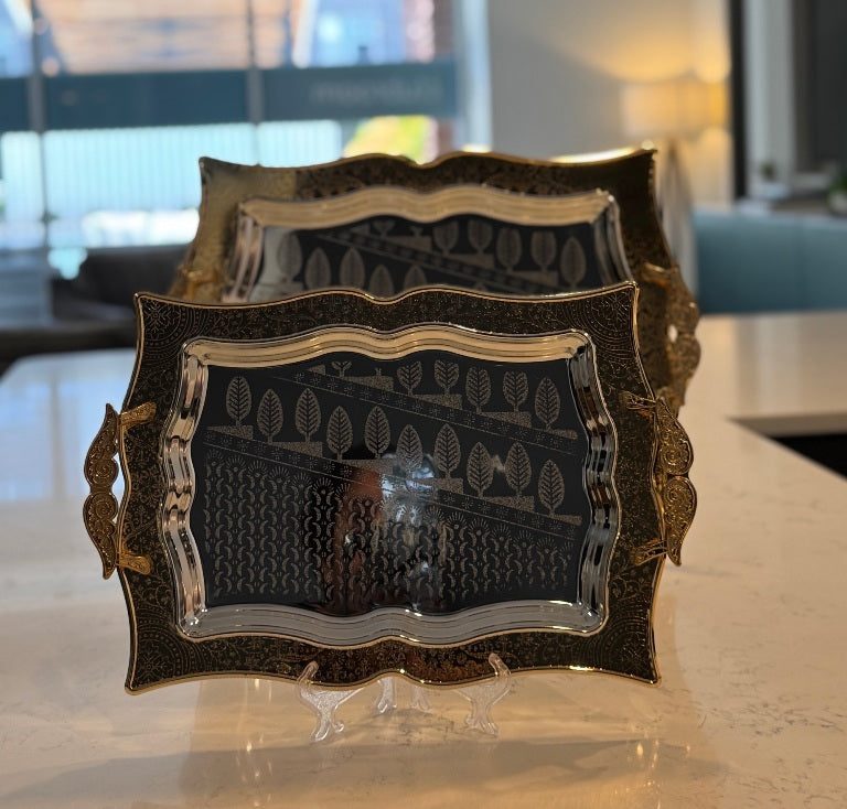 Elevate your hosting with this elegant 2-piece stainless steel serving tray set. Designed with a golden border and a sleek silver center, these trays add a touch of luxury to your table setting. Perfect for serving snacks, desserts, fruits, nuts, candies, cakes, tea, or coffee, they make every occasion feel special.